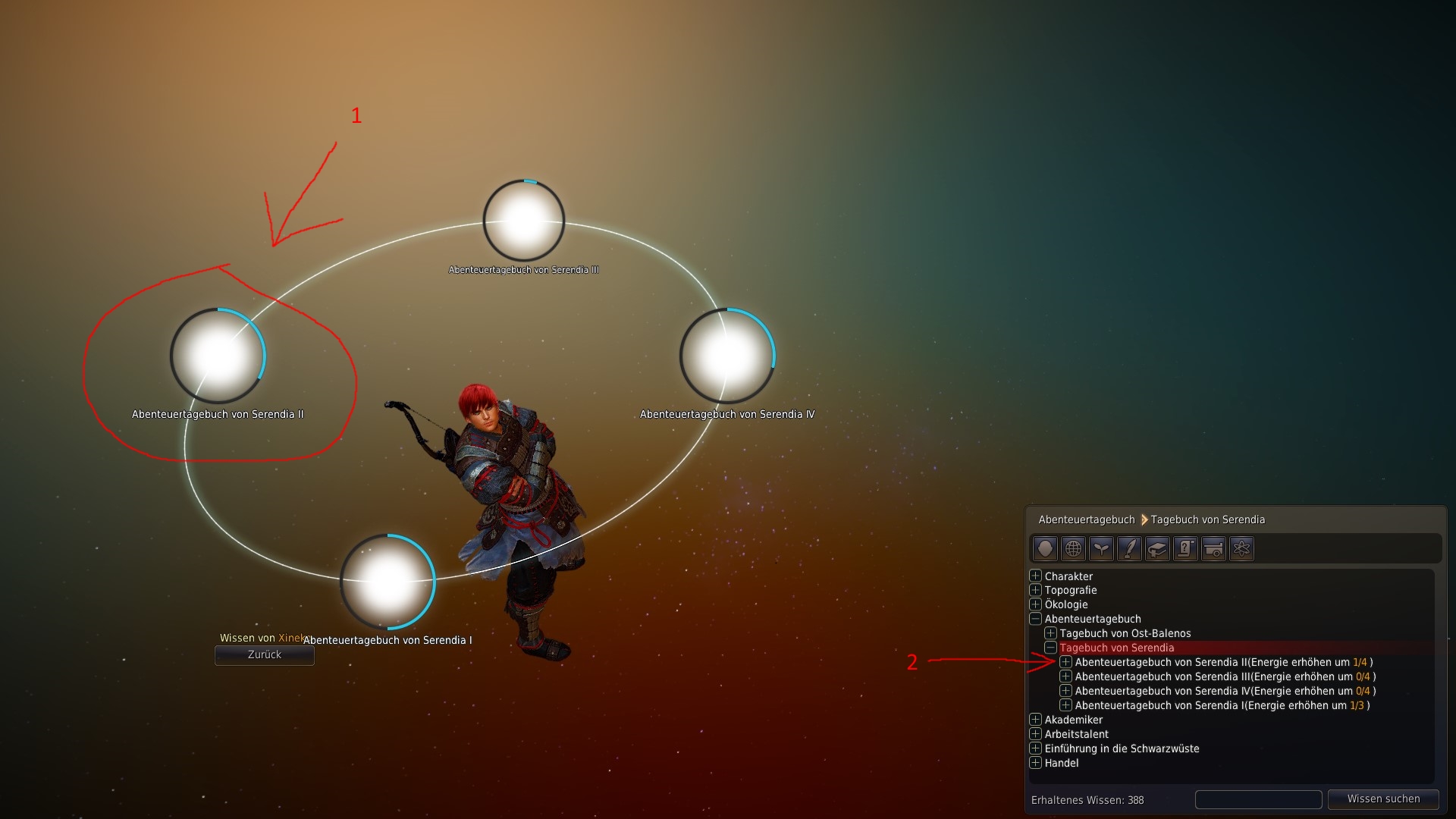 Zu 1) Hier ist das Themengebiet "Abenteuertagebuch Serendia II" aufgeführt. Wie man sieht ist noch nicht jedes Wissen zu diesem Thema erforscht. Wichtig ist hier der Name, denn er ist identisch mit dem Themengebiet, dass man bei NPCs einsehen kann wenn man für Gespräche mit ihnen, wissen benötigt.